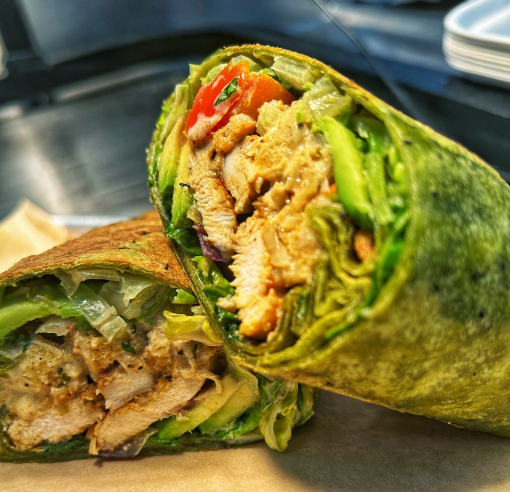 Pressed Spinach Wrap, Diced Chicken Breast, Chopped Romaine, Red Onion, Cherry Tomatoes, Avocado, Grated